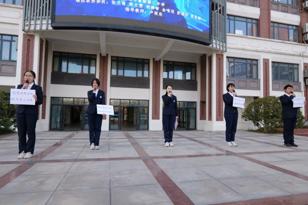 模拟政协社的同学们随后登场展示,他们以敏锐的洞察力聚焦人工智能素养培育这一时代命题,用调研和演绎诠释了新时代青年在科技强国建设中的责任与担当,展现了曹二学子关注科技发展、助力青少年人工智能教育的赤诚之心。