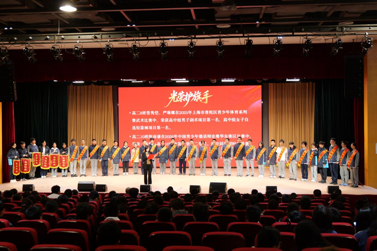 仪式在庄严的国歌声中拉开帷幕。首先,谈俊副校长宣读了四月份光荣护旗手名单,激励全体同学以榜样为力量,砥砺前行。