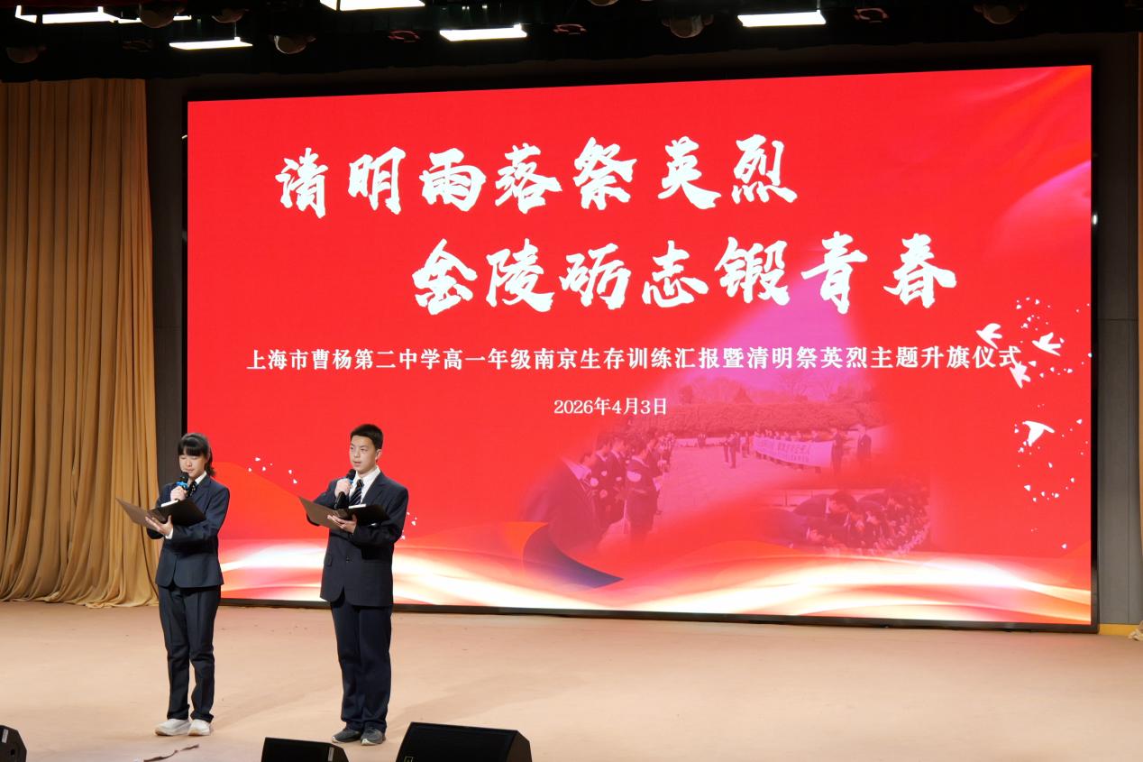 2026年4月3日早晨,我校在小剧场举行了以“清明雨落祭英烈,金陵砺志锻青春”为主题的升旗仪式,旨在总结南京生存训练,缅怀烈,传承红色精神。